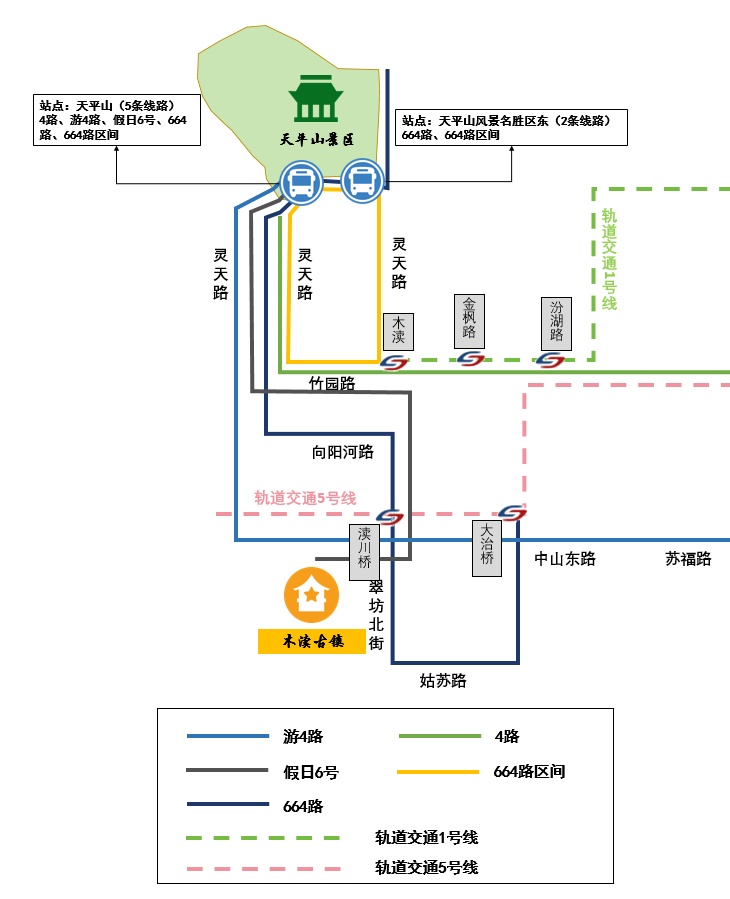 停靠站点:木渎影视城P5停车场、天平山景区P1停车场、竹园路灵天路东公交站(祥里村P4停车场)、经二路公交站(河上村P3停车场)。