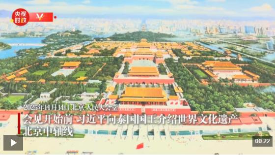 会见开始前,习近平向泰国国王介绍世界文化遗产——北京中轴线。