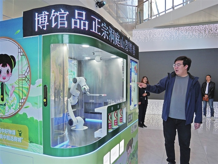 制作碧螺春新茶饮的机器人,已在苏州博物馆游客中心、中国洞庭山碧螺春茶博物馆等站点投放,受到年轻消费群体的欢迎,也引起此次参加活动嘉宾的兴趣。 记者 徐靖怡 摄