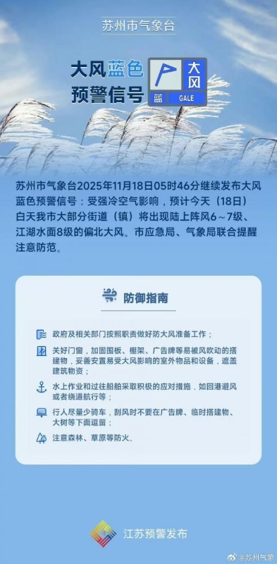 苏州市气象台2025年11月18日05时46分继续发布大风蓝色预警信号:受强冷空气影响,预计今天(11月18日)白天我市大部分街道(镇)将出现陆上阵风6~7级、江湖水面8级的偏北大风。市应急局、气象局联合提醒注意防范。