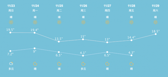 昨天(11月22日)苏城白天阳光很好,暖意融融。短期内是冷空气间歇期,苏州天气都很晴好,今天苏城多云,气温7℃~20℃。明天多云到晴,气温10℃~20℃,体感也很舒适,就是空气湿度有所下降,注意多喝水多补充水分。