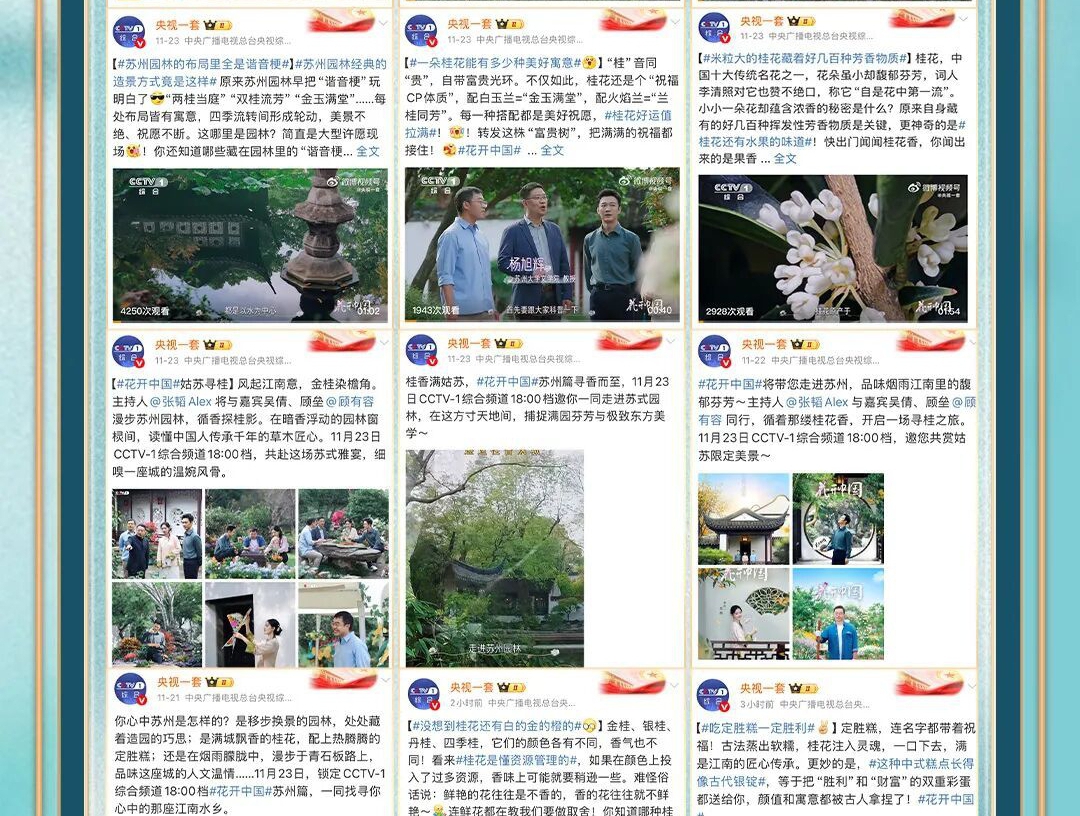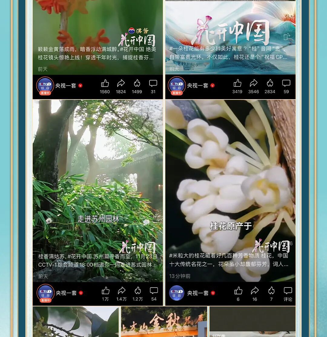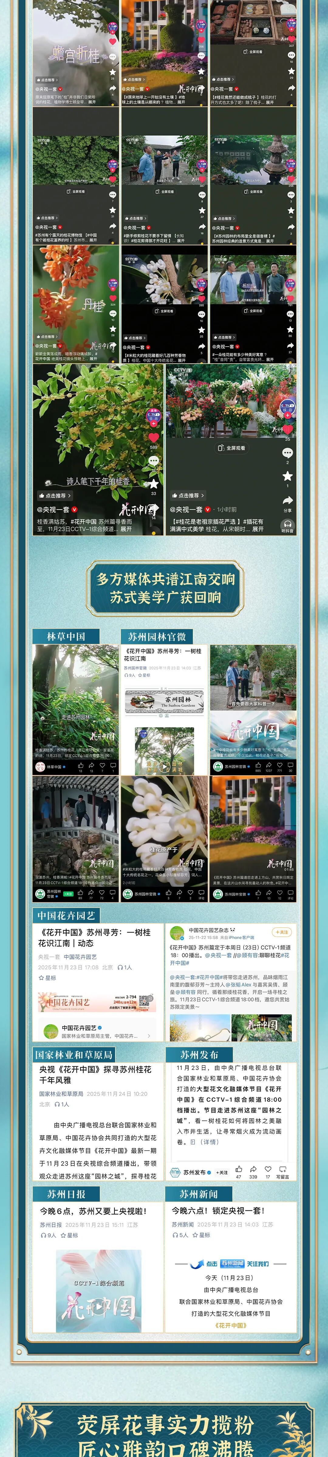 11月23日,央视《花开中国》苏州篇在CCTV-1综合频道档播出后引起全网热议和全国关注,本期节目将桂花置于苏州的文化语境中,从园林美学、市井生活到产业经济,多维度解读了这抹秋香如何浸润一座城。
