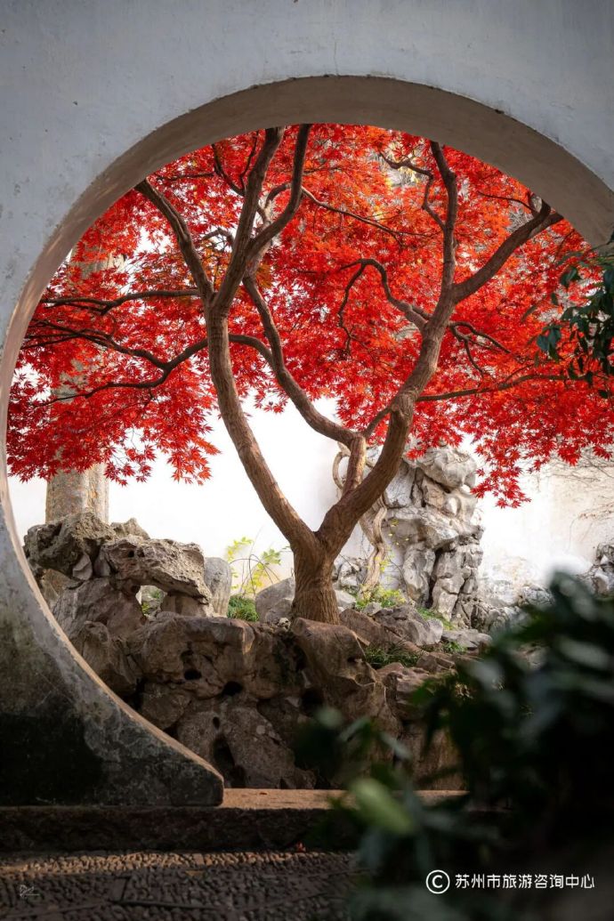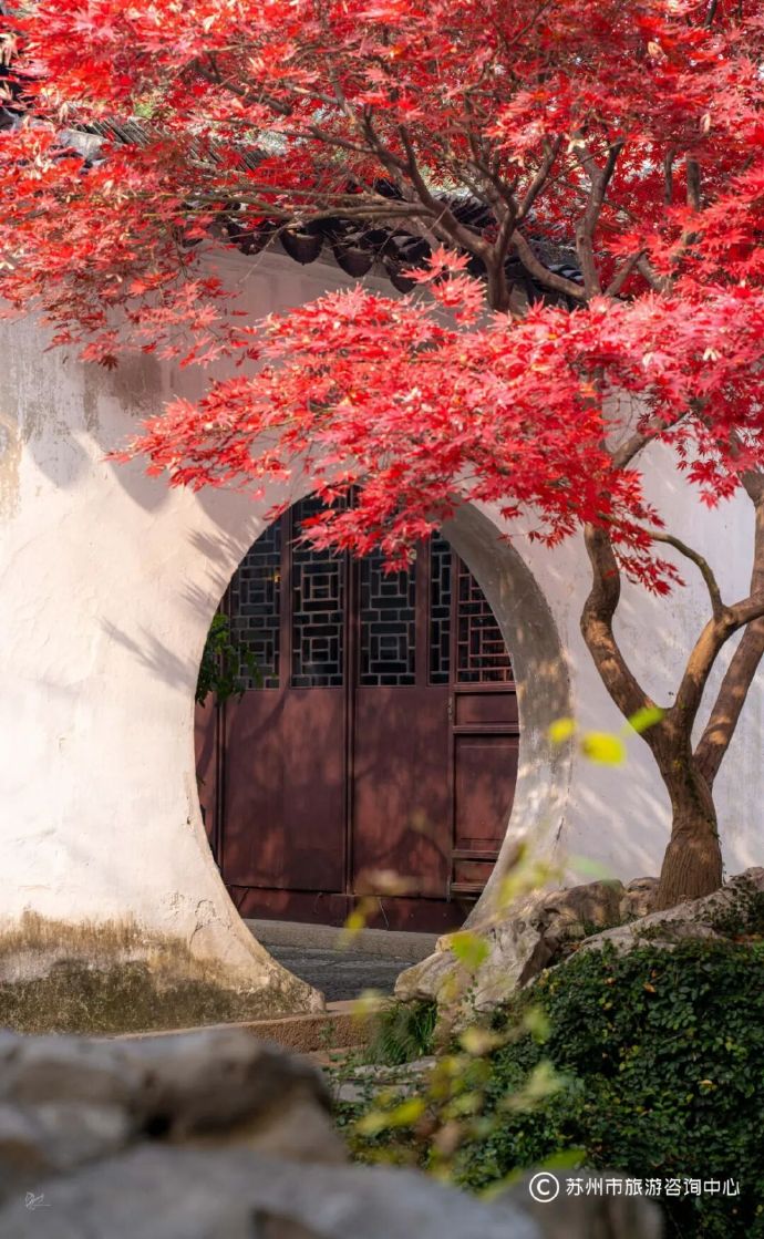 深秋的艺圃,芹庐小院与浴鸥月洞门静静对望,几树红枫恰如其分地燃在其间,便将满园的清寂与雅致,烘托成一场视觉的盛宴。