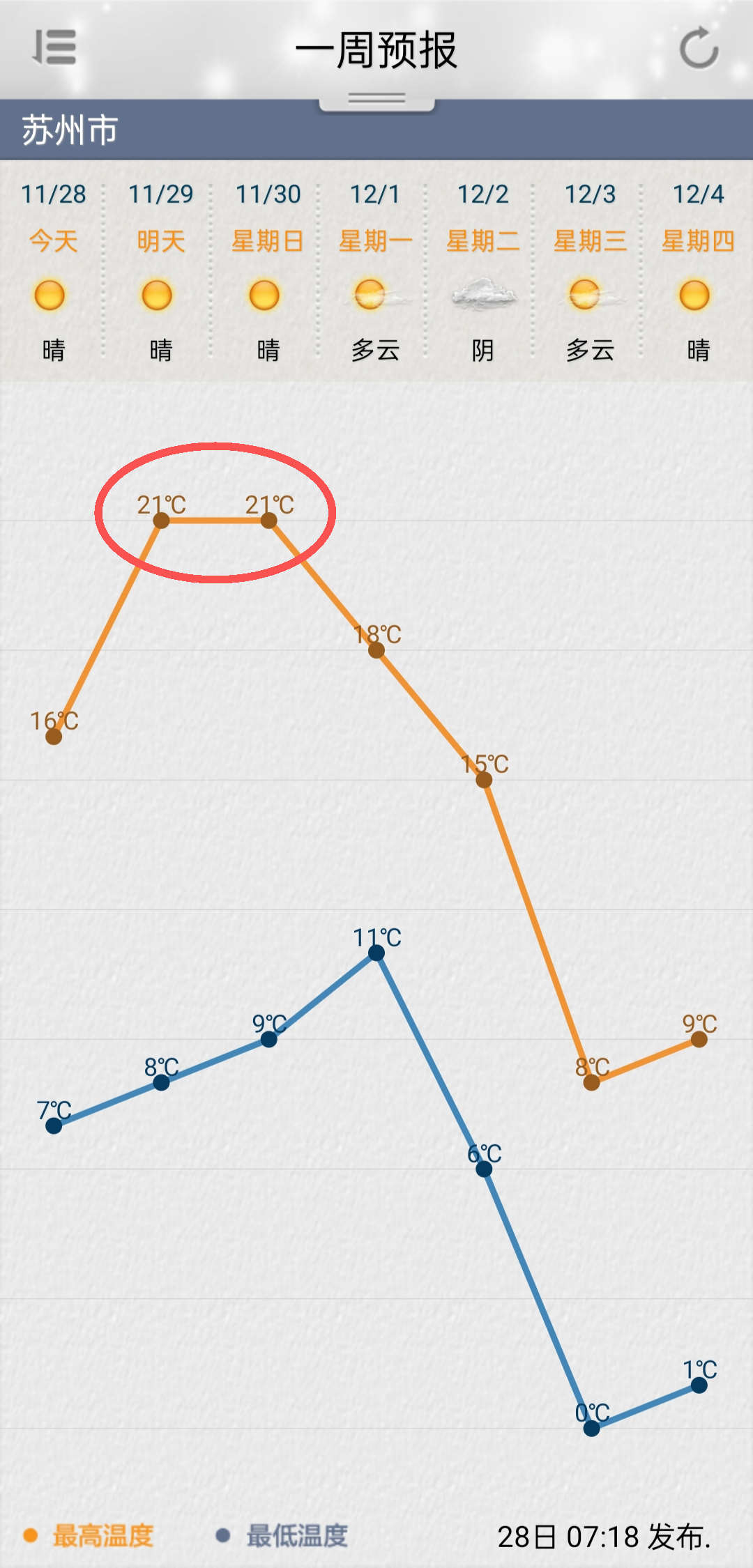 苏州市气象台预计,11月29晴到多云。南风3~4级。11月29日早晨的最低气温在7℃左右,白天最高气温在21℃左右。预计11月30日多云,气温在8℃~22℃之间。