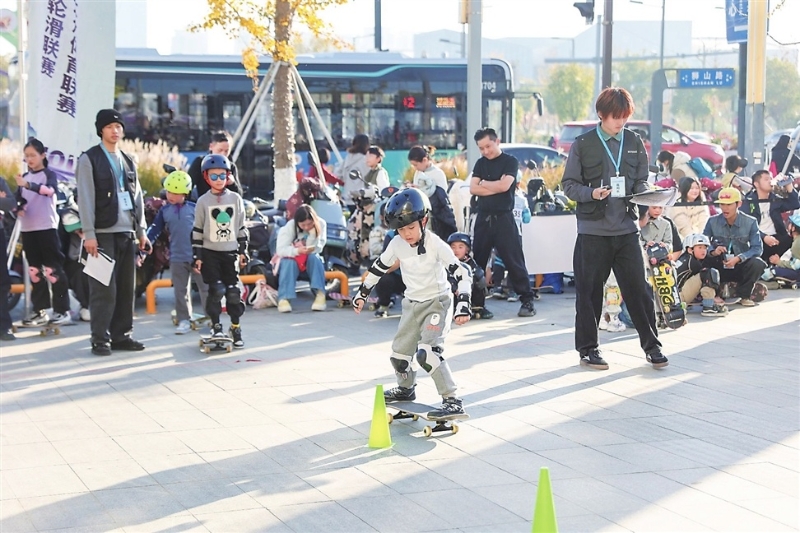 赛事设置四大核心项目,兼顾竞技性与趣味性。道具障碍计时赛中,选手需依次通过斜面、弧面、波浪道、雪糕筒等趣味障碍,未通过或双脚离板将面临相应加时;荡板绕桩赛以50米折返赛道为基础,25米间距设置锥桶,考验选手的平衡控制与滑行速度;亲子趣味竞速则采用25米直线滑行模式,家长推坐滑板的儿童前进,中途掉落即淘汰,充满温馨互动;Game of Skate项目通过抽签分组进行对决,选手可借助场地道具出招,分组晋级后决出最终名次。其中,U9组报名大热门,有41名小滑手同场竞技,场面热闹非凡。今年四年级的刘彰正就是该组别的代表性选手。他说:“虽然训练时经常摔跤,但每次学会新动作都特别有成就感,我的目标是尽快练会奥利跳。”(记者 张黎丽)