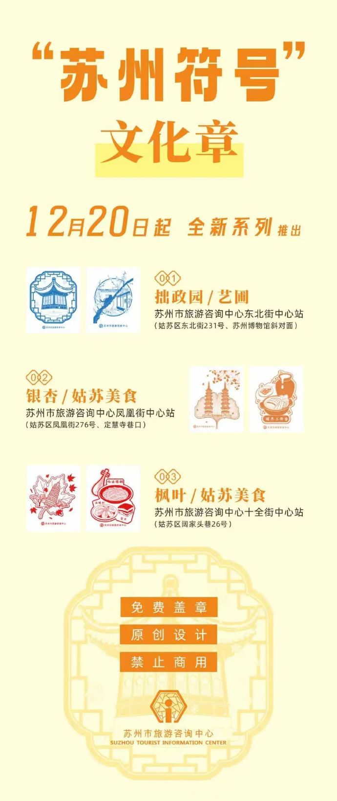 苏州市旅游咨询中心特别定制了6枚全新的 “苏州符号”主题系列文化章,来苏州市旅游咨询中心东北街、凤凰街、十全街三个中心站就能盖到哦!