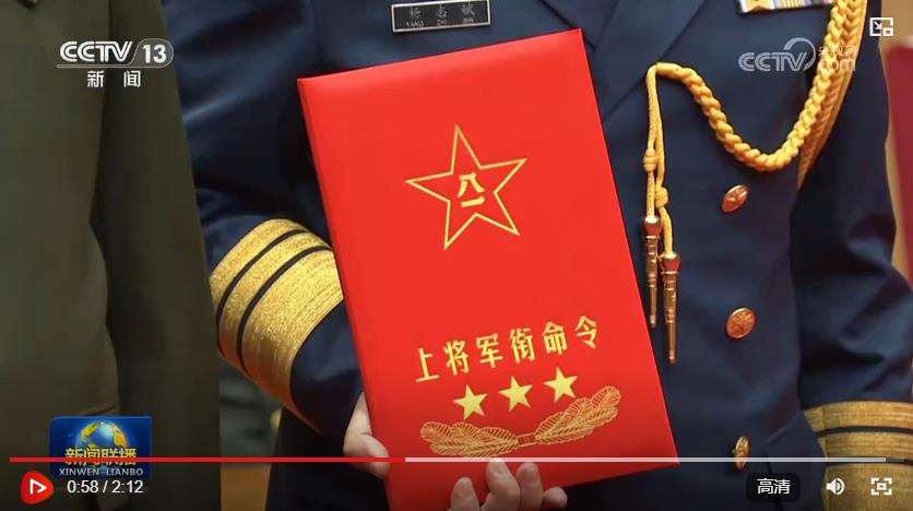 习近平向晋升上将军衔的东部战区司令员杨志斌、中部战区司令员韩胜延颁发命令状,表示祝贺。佩戴上将军衔的2位军官向习近平敬礼,向参加仪式的全体同志敬礼,全场响起热烈掌声。