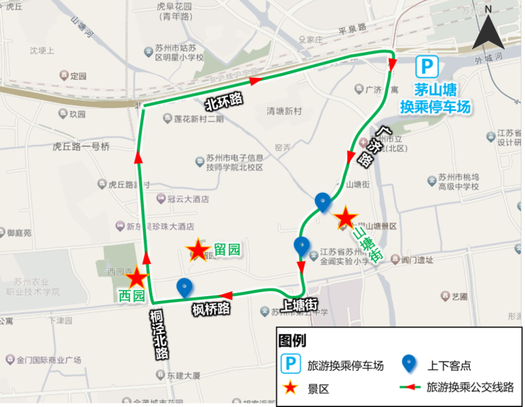 茅山塘换乘停车场循环线路(运行时间8:00-18:00):茅山塘换乘停车场-广济路(山塘街景区)—广济路(“金阊实验小学”站,步行约700米至留园景区)—上塘街—枫桥路(“永津桥东”站,步行约500米至西园景区)—桐泾北路—北环路—广济路—茅山塘换乘停车场。