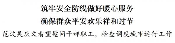 1月1日,市委书记范波、市长吴庆文分别率队看望慰问元旦假期坚守岗位一线的干部职工,检查调度城市运行和安全生产工作。范波指出,跨年夜各项活动平稳有序,全市上下各相关方面都付出了辛苦努力。他强调,要深入学习贯彻习近平总书记重要指示精神,认真落实党中央、国务院部署和省委、省政府要求,坚持人民至上、生命至上,以“时时放心不下”的责任感,继续抓实抓细节日期间安全生产工作,用心用情做好暖心服务保障,确保城市安全有序运行、群众平安欢乐祥和过节。