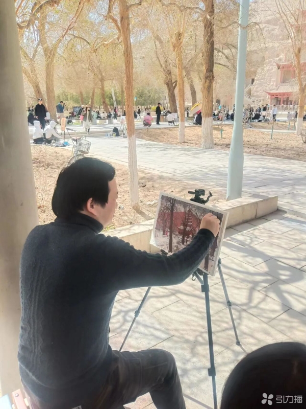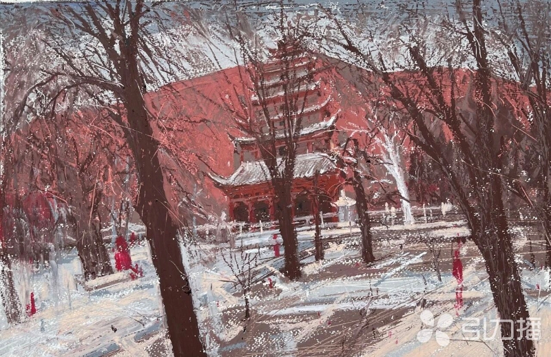 李磊老师的《林间楼阁》创作于2023年。彼时,他带领美术班学生赴敦煌研学写生,便以莫高窟标志性建筑“九层楼”为灵感,在莫高窟前实地写生完成了该作品。作品以油画棒为媒介,凭借奔放洒脱的笔触、大胆鲜明的色块构成,在画布上构筑出极具张力的视觉节奏,生动诠释了敦煌莫高窟独有的艺术神韵。