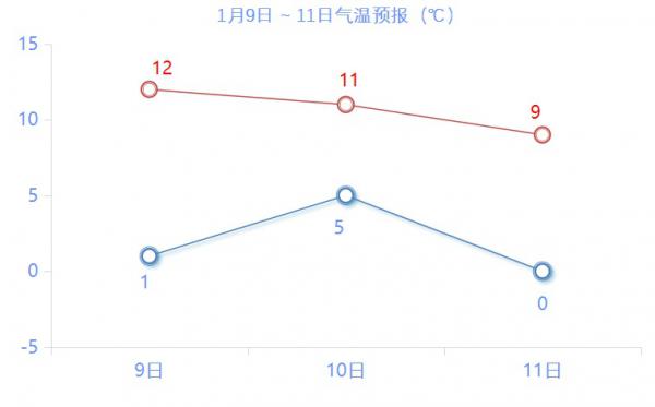苏州市气象台预计,1月9日多云到晴。北风转南风,风力都是3~4级。1月9日早晨的最低气温在0℃左右,白天最高气温升到12℃左右。短期内天气不错,温差较大,早晚仍然偏冷,森林火险气象等级高,需注意用火用电安全。预计1月10日多云,气温在4℃~10℃之间。