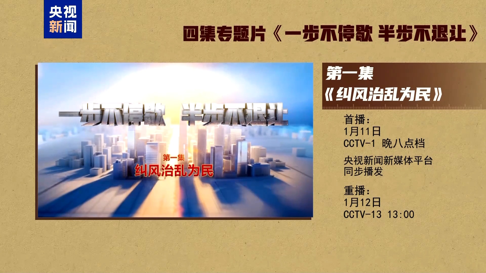 电视专题片《一步不停歇 半步不退让》第一集《纠风治乱为民》,讲述纪检监察机关不断加大风腐同查同治力度,锲而不舍落实中央八项规定精神,严肃查处违规吃喝背后的团团伙伙、请托办事和利益输送,集中整治群众身边不正之风和腐败问题,让群众真切感到正风反腐加力度、清风正气在身边。总台央视综合频道1月11日晚8点档播出,央视新闻新媒体平台同步播发。