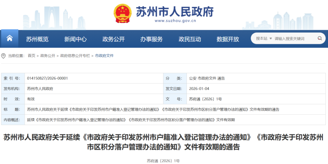近日,苏州市人民政府关于延续《市政府关于印发苏州市户籍准入登记管理办法的通知》《市政府关于印发苏州市区积分落户管理办法的通知》文件有效期的通告发布。