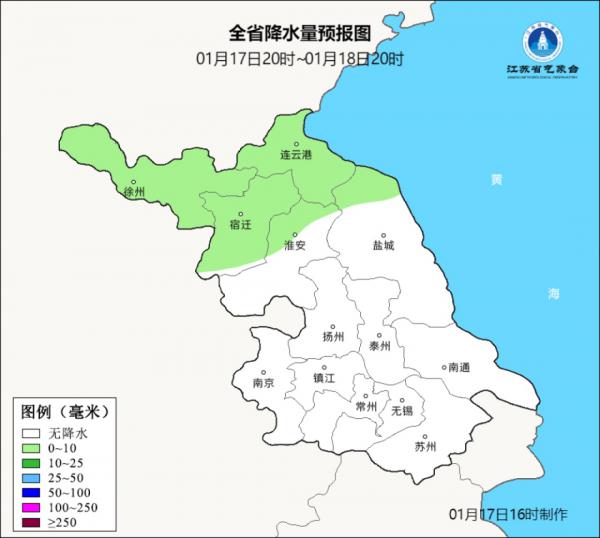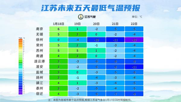 据江苏气象预报,北方有一股强冷空气正在东移南下,预计18日夜间自北向南开始影响我省,受其影响,全省48小时最低气温将下降8~11℃,局部12~13℃,并伴有陆上7-8级江河湖库及近海海面8-9级的偏北大风,21-23日最低气温淮北地区-9~-14℃,苏南地区-3~-6℃,其他地区-6~-9℃,徐州22日的最低温低至-15℃。