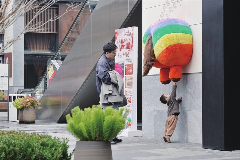 上周末,环宇荟的艺术装置前,好奇的孩子踮起脚尖伸手触碰马蹄。