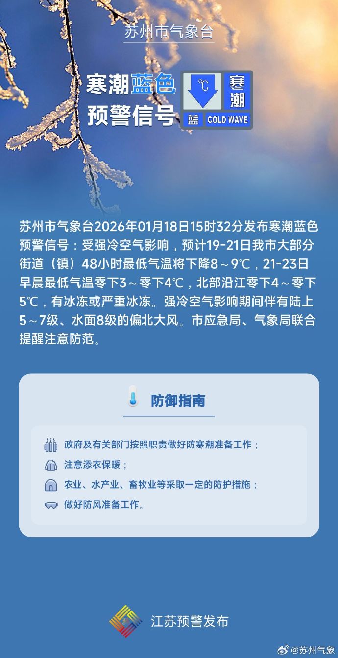 昨天(1月18日)下午,苏州市气象局发布寒潮蓝色预警信号,未来一周苏城将遇冰冻天气。苏州市应急管理部门提醒市民:注意防寒保暖,各生产经营单位要做好应急预案,增强防范意识。