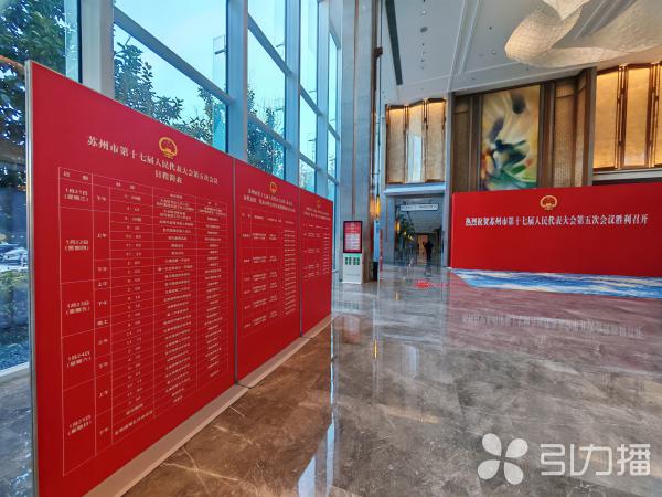 在会场大堂,主展板上“热烈祝贺苏州市第十七届人民代表大会第五次会议胜利召开”的标语庄严醒目,墙上悬挂的大红中国结美观大方。大会日程简表和各代表团、代表小组导览牌让人一目了然。在大会秘书处,工作人员正有条不紊地准备着会议文件。沿着指引牌来到大会各分组讨论室,只见会标、席卡等物料全部布置到位。
