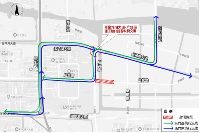 施工期间,经过启慧路(广贤街-桑田街)的机动车、非机动车和行人从金鸡湖大道、独墅湖大道等道路通行。