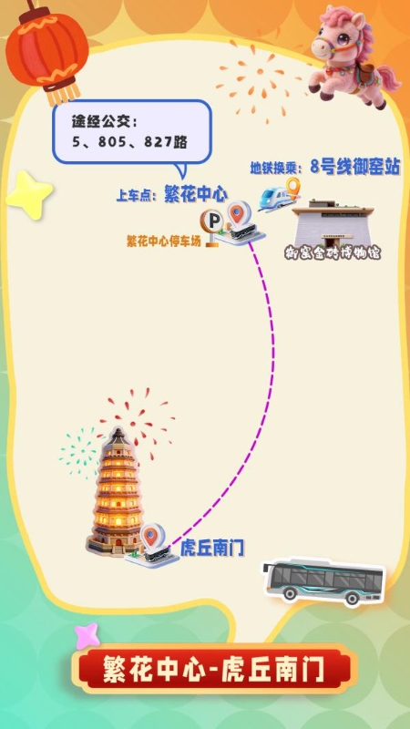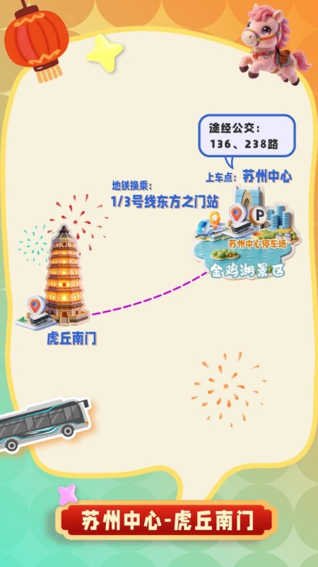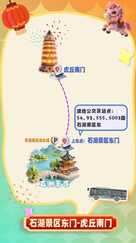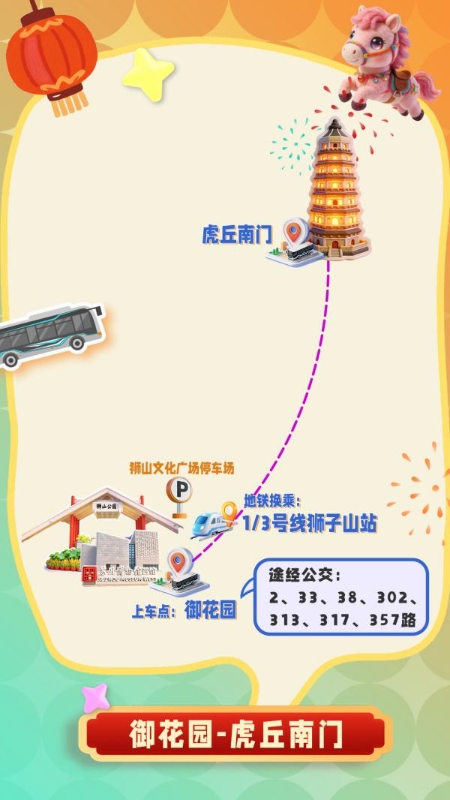 四条专线分别以石湖景区东门、相城区繁花中心、苏州高新区狮山文化广场、苏州工业园区苏州中心为起点,直达虎丘南门,市民可就近选择上车点,直达赏灯目的地。