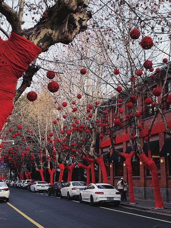 一拐进这条种满法国梧桐的流虹路,映入眼帘的就是鲜艳又喜庆的红色。路旁所有法国梧桐的树干都缠上了红色毛线,摸上去,柔软亲肤,像一件件毛衣。路面上方的树梢上,大量的红色藤球点缀其间。冬日暖阳下,它们随风轻舞,华灯初上时,有些藤球里散发出柔和的灯光,仿佛为流虹路系上了红围巾,氛围感悄然“拉满”。