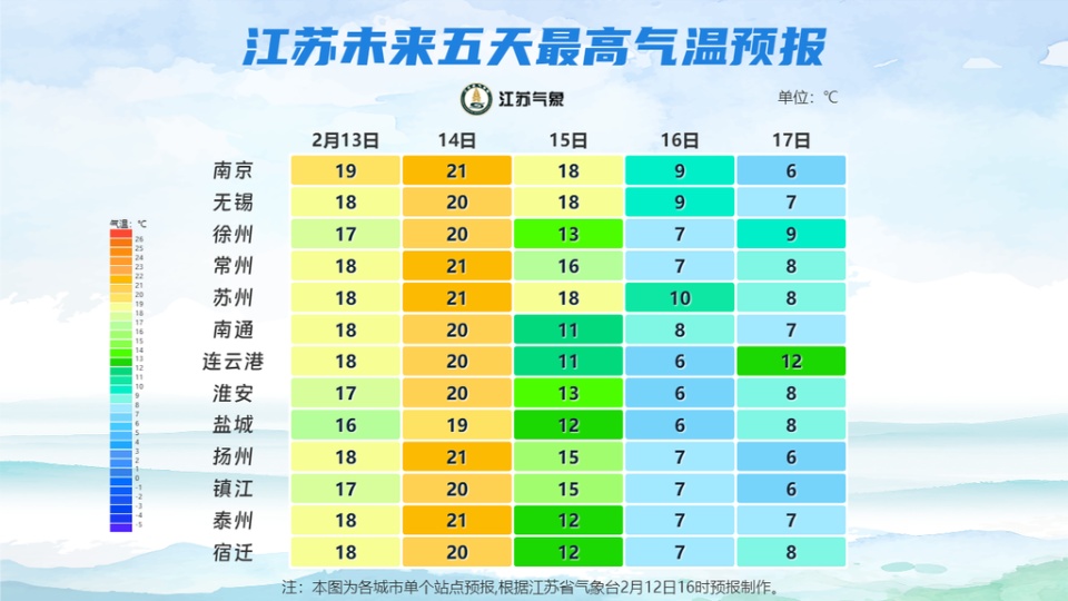 全省多云。最高温度:全省20~21℃;最低温度:苏南地区5~6℃,其他地区3℃左右。全省偏南风3-4级。