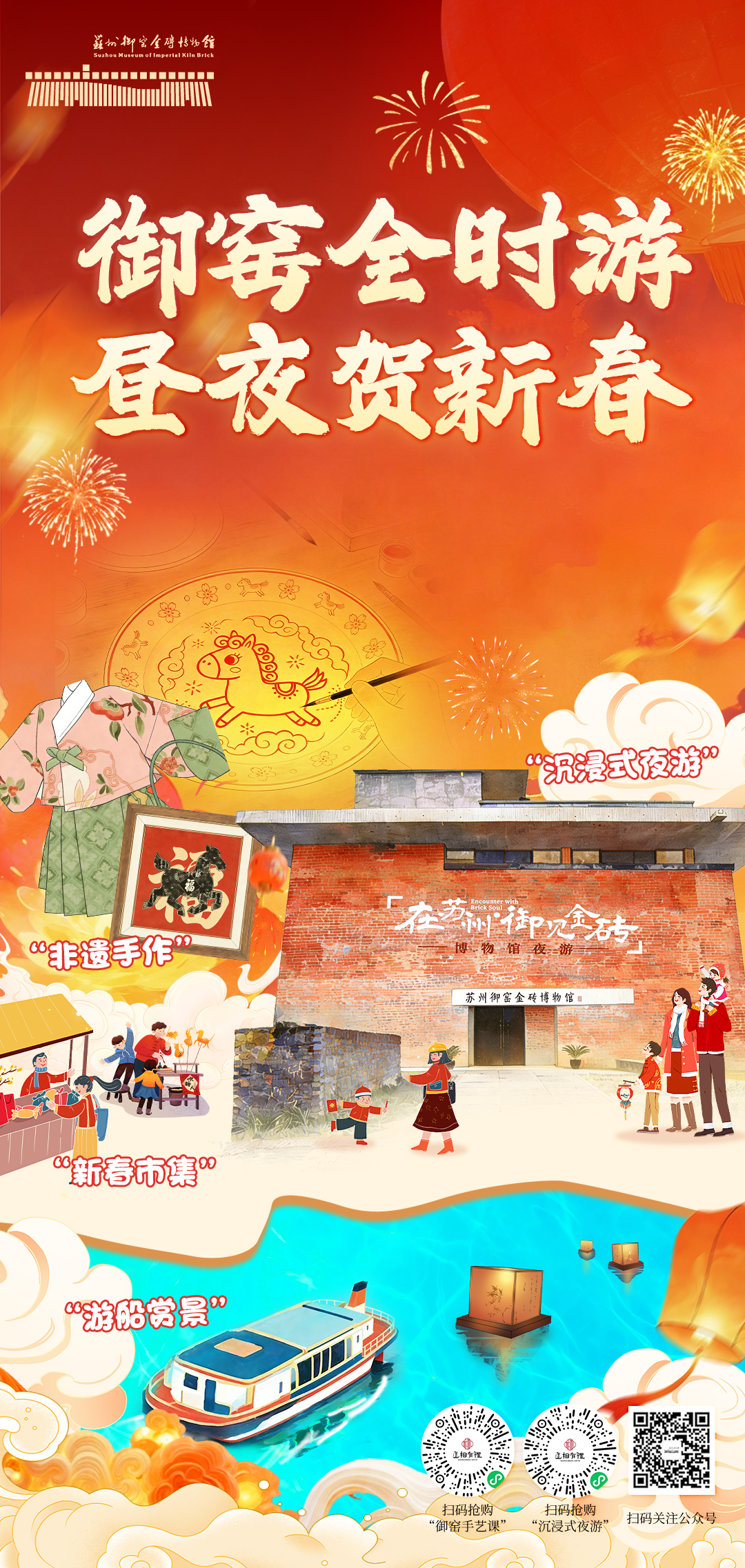 春节期间推出三大主题活动:“在苏州·御见金砖”沉浸式夜游(剧情互动、灯谜解谜、抽奖)、“御窑手艺课”新春手作(写福、金石马、香佩等)及新春市集(灯彩、祈福架),打造日夜皆景的新春文化体验。