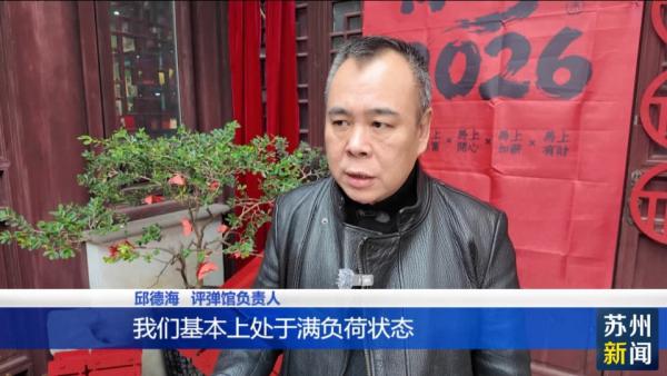 评弹馆负责人邱德海表示,基本上,从初一开始到初三为止,处于满负荷状态,现在的预定量到年初八,每天都已经有超过50%的预定量,每天都会安排一位一级演员坐镇。更希望来苏州的这些游客能深切地,短时间内去感受到苏州评弹的魅力。