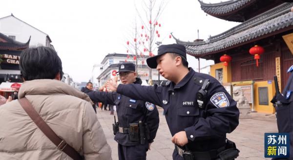 2月19日上午,观前街人潮涌动,处处洋溢着浓郁的节日氛围。在熙攘的人群中,00后民警夏添正带领队员们在街上巡逻,并不时停下来,耐心解答游客的询问。