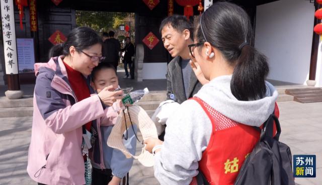 在枫桥景区,大一学生张沁艳正耐心帮游客拍照合影。这是她在这个春节假期当志愿者的第八天,捡拾垃圾、检票引导、周边公共交通指引……事无巨细、耐心细致。