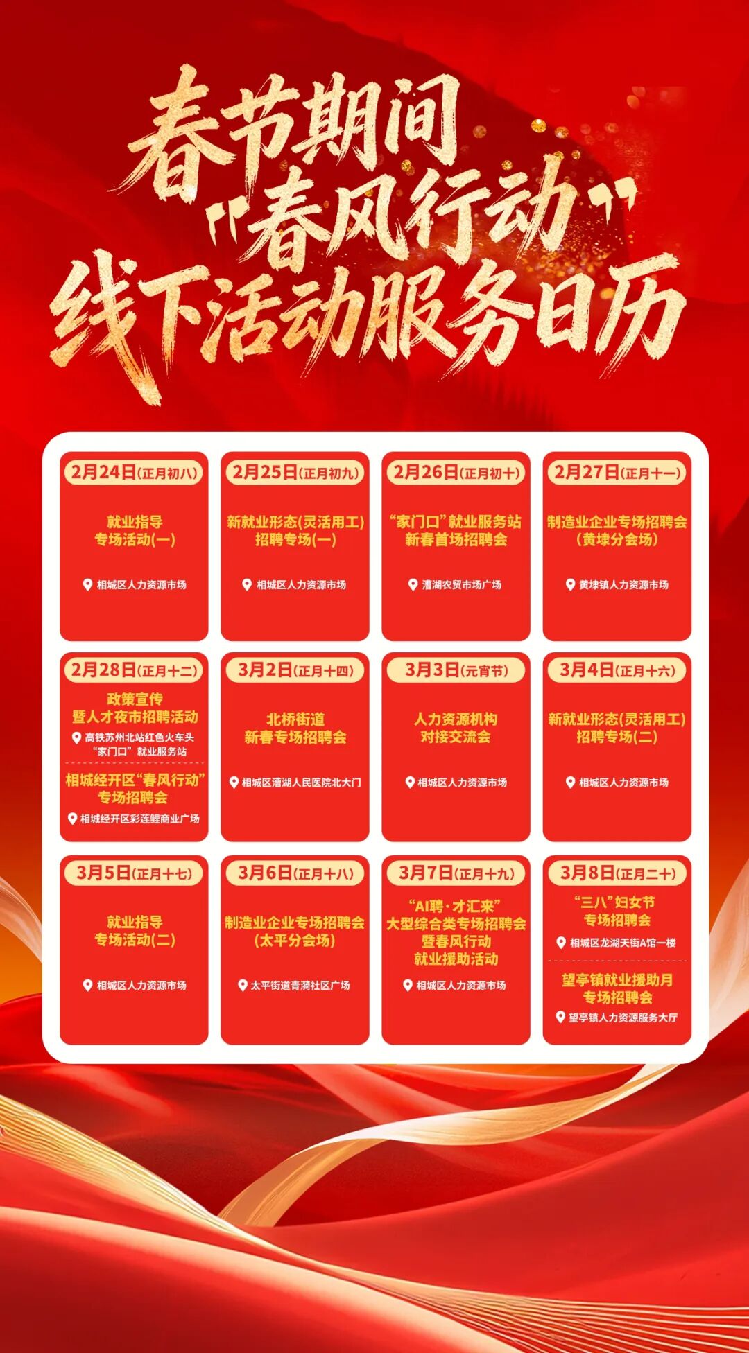 随着新春复工复产序幕拉开,相城区同步更新“春风行动”系列活动日历,即日起至5月密集举办超过30场各类线下专场招聘与就业服务活动。活动涵盖制造业企业专场招聘会、新就业形态(灵活用工)招聘专场、“家门口”就业服务站招聘会、大型综合类招聘会、“三八”妇女节专场招聘会、人才夜市、本地高校招聘专场等,服务网络覆盖全区各板块,将岗位与服务直接送到群众身边。同时,跨省劳务对接、就业指导、创业帮扶、政策宣传等专项活动同步推进,为求职者提供从岗位匹配到技能提升、政策咨询的全链条支持,助力各类求职群体实现稳定就业。