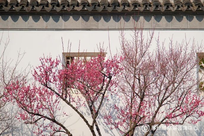 秋香园位于唐寅园附近,清新雅致的红梅与白梅,映衬着粉墙黛瓦与亭台轩榭,更显古韵悠悠。