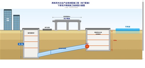 高铁苏州北站产业商务配套工程(地下配套)下穿京沪高铁施工纵剖面示意图(未按实际比例绘剖) 阮剑 葛皓珺 制图