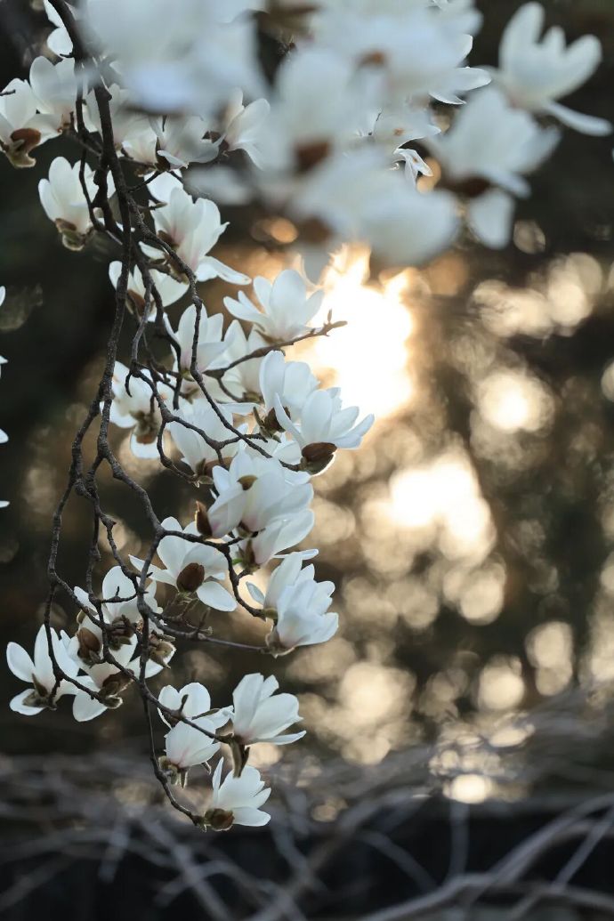 视野豁然开朗,近前玉兰如雪。风过时,花瓣与云影仿佛一同流动。