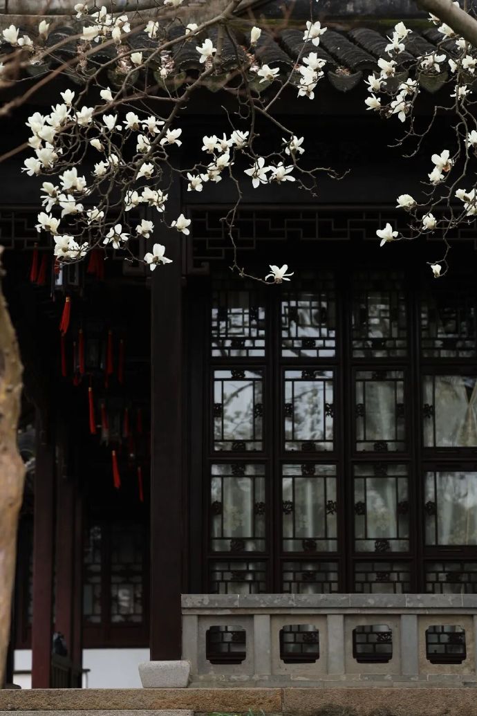 回廊逶迤,玉兰从雕花木窗间探出身来,光影在花瓣上走走停停,仿佛时间也慢了三分。