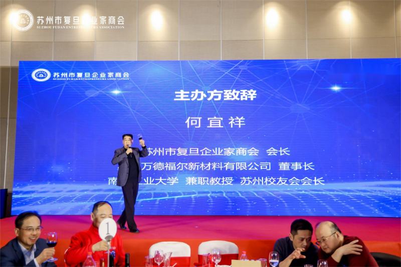 “智造未来·出海远航”苏州市复旦企业家商会2026年新春团拜会由苏州市复旦企业家商会梅娜校友开场主持, 苏州市复旦企业家商会会长、苏州万德福尔新材料有限公司董事长、南京工业大学兼职教授 、 苏州校友会会长何宜祥先生上台致辞, 他强调民营企业家要始终保持 “自律、自燃、自愈”的创业初心,要心怀敬畏,敬畏市场,敬畏职业规则、敬畏职业道德,敬天爱人,心怀善念,持戒而行,感恩与善良是做人最大的底气与自信,越优秀的人越自律,越自律的人越优秀,民营企业家要始终践行“利他、舍得”的商业行为,秉承“正人律己、问心无愧”的做人精神,力争将企业“做专、做精、做强、做久”,为苏州地方经济及社会建设添砖加瓦,再做新贡献,再创新辉煌!