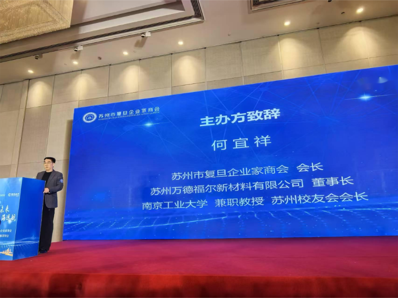 随后,苏州市复旦企业家商会会长、苏州万德福尔新材料有限公司董事长、南京工业大学兼职教授、苏州校友会会长何宜祥先生登台致辞,向全体校友、嘉宾致以诚挚问候与美好祝愿,寄语大家同心聚力、共谱新篇,以更加昂扬的姿态奔赴新程、再创辉煌。