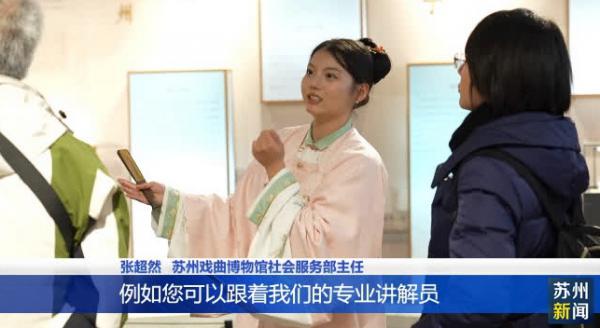 苏州戏曲博物馆社会服务部主任张超然介绍,例如可以跟着专业讲解员或者是志愿者来参观博物馆,了解昆曲史,同时也可以登上戏台跟着专业的昆曲老师学习一下昆剧中的唱念做打的基本动作,如果感兴趣的话甚至可以穿上戏服来打卡独属于自己的昆曲造型。