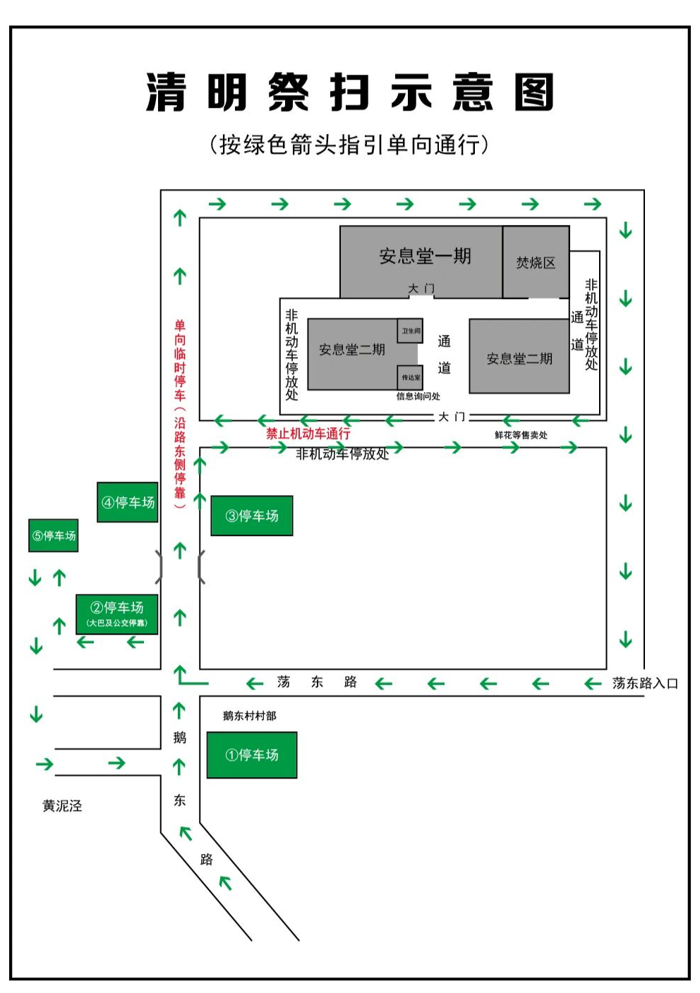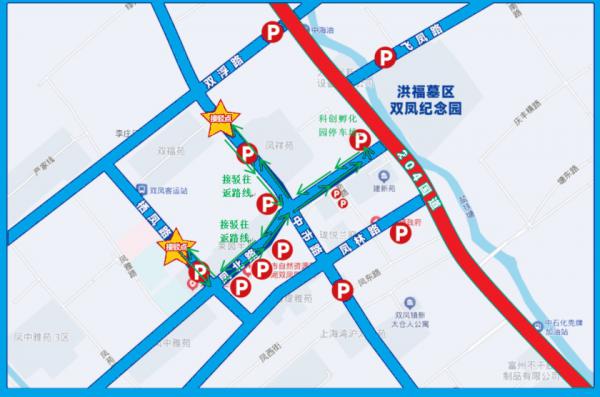 行车线路:204国道东侧区域设置货车和专项作业车禁行,墓区交通组织方式设置北侧204国道安息堂路口为单行进口,南侧204国道新泾路口为单行出口。