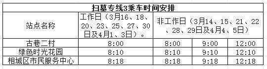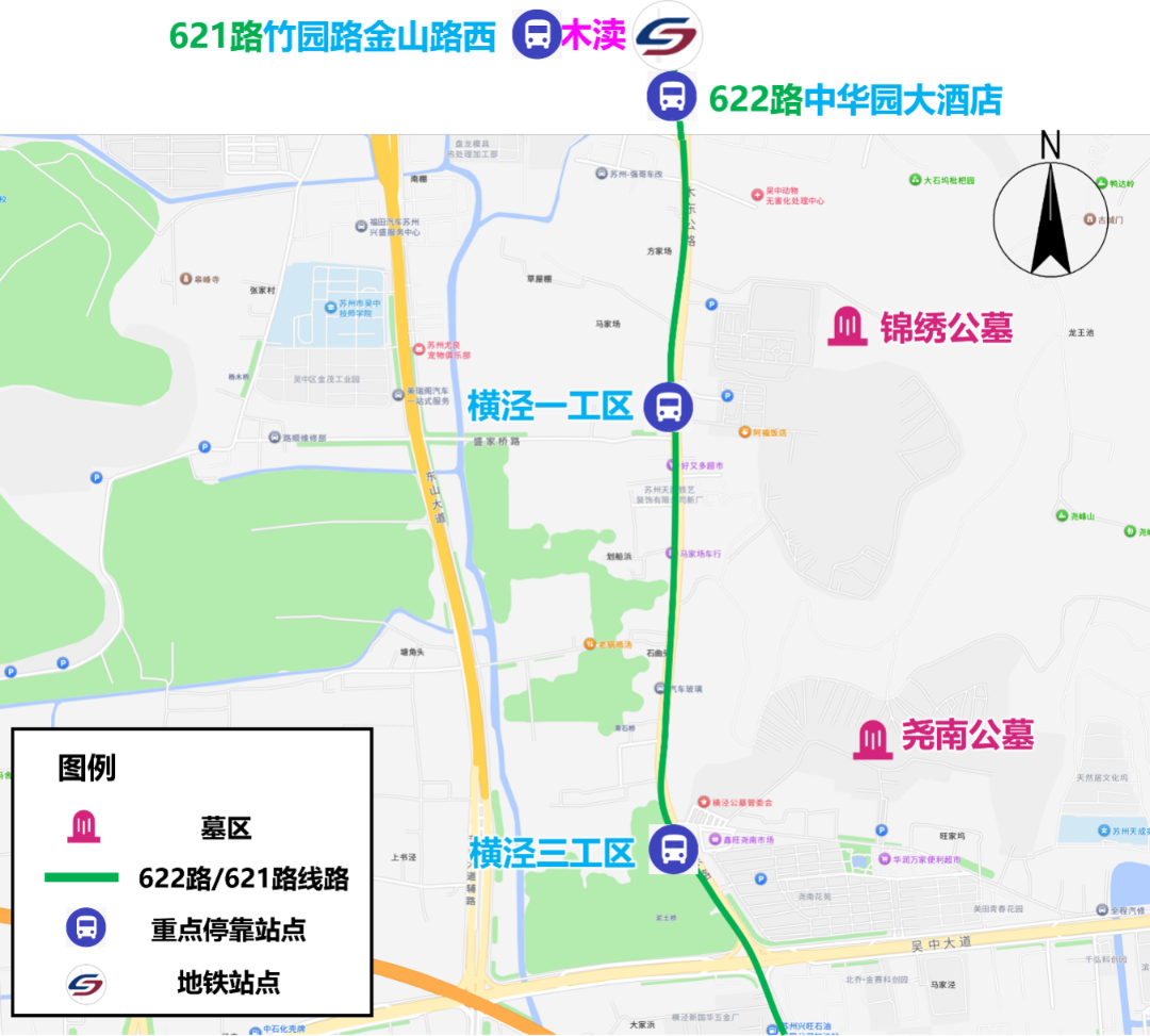 注:1、扫墓高峰期加密该段车次,无人上下客站点跳站运行。2、扫墓结束后,可至原线下车站点对向公交站点乘车返回地铁7号线石湖莫舍站或地铁1号线木渎站。
