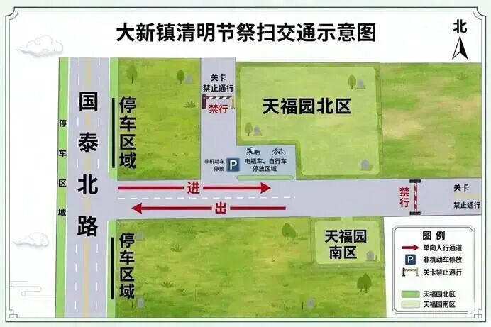 机动车辆可停放于国泰北路两侧,非机动车请停放在北区门口划线区域。请祭扫车辆服从现场指挥,有序通行、停放。注意:4月5日清明当天,天福园北区西侧道路与南区北侧道路将禁止机动车通行。