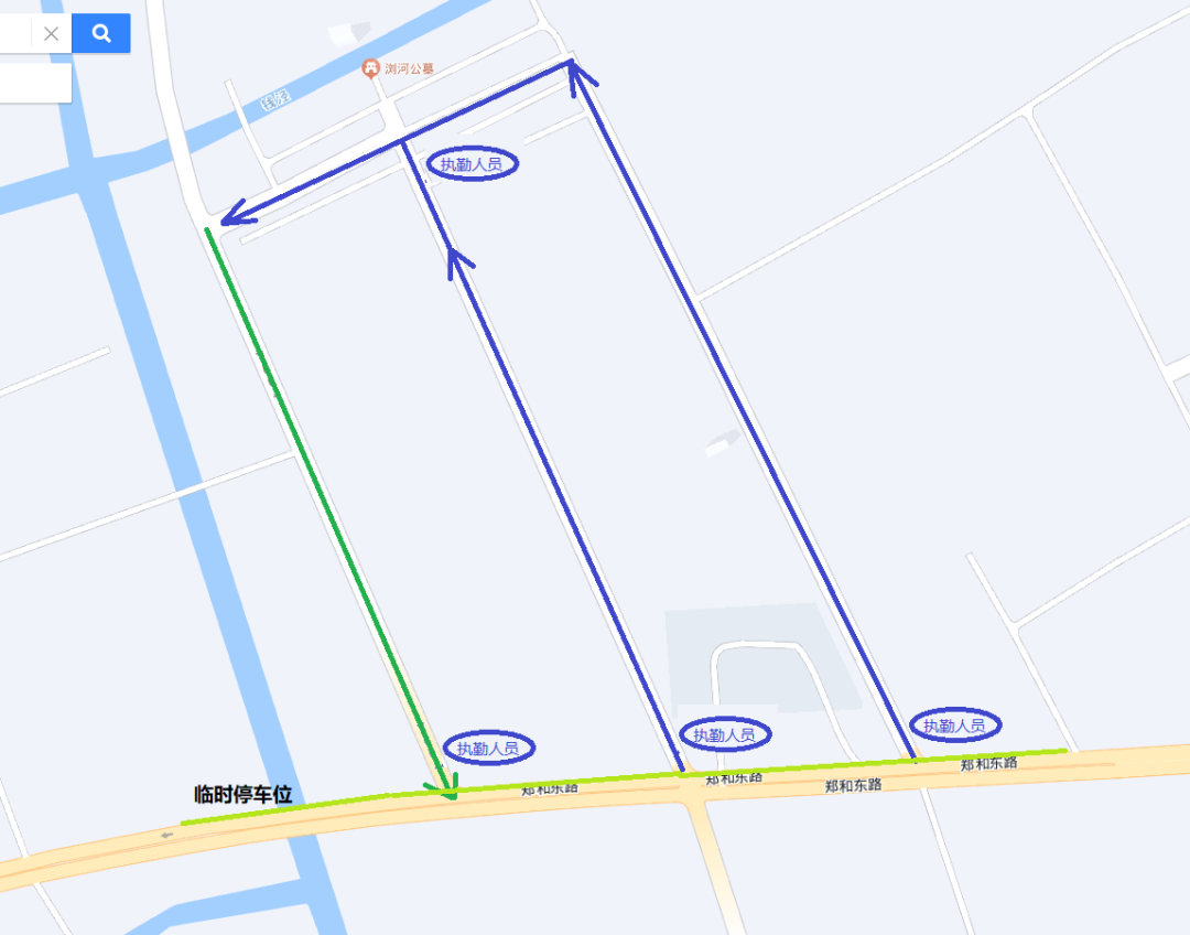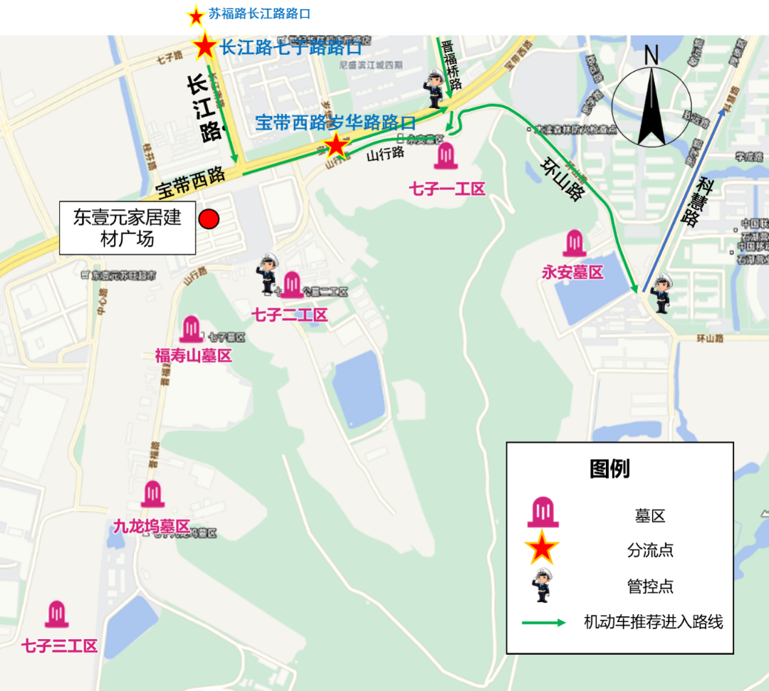 行车线路:龙江路、静园路路口东向西前往墓区,扫墓结束后向西经由吴泾路、苏州东路路口离开。