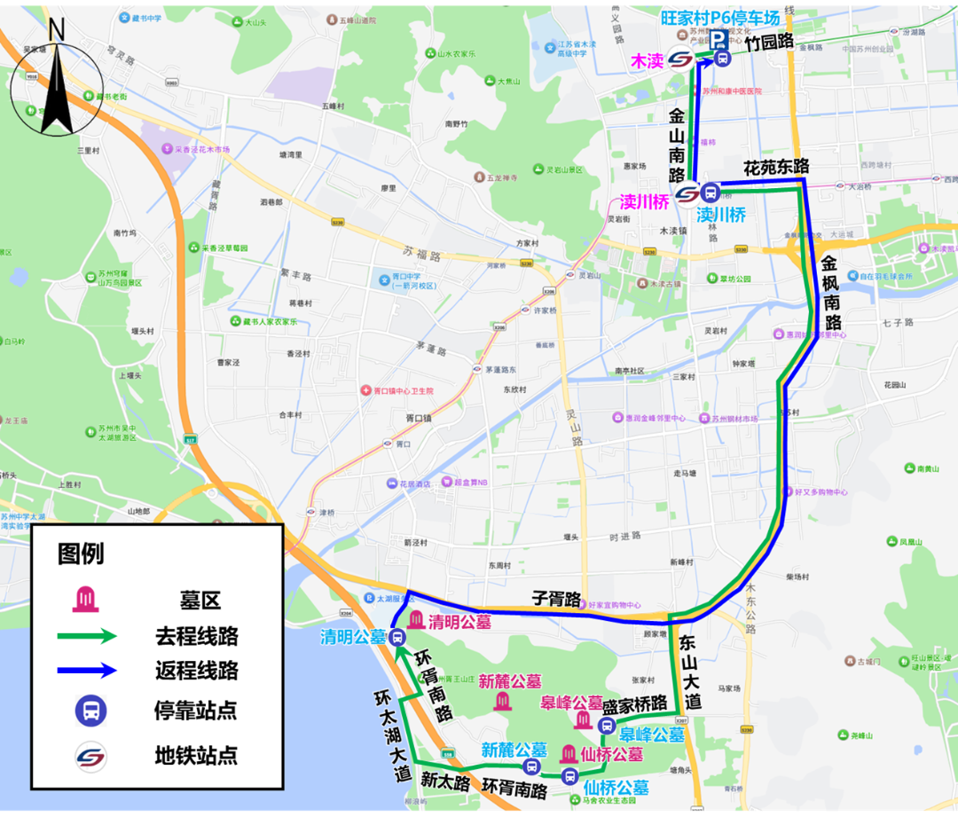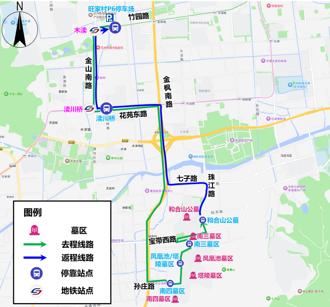 接驳线路(7:00-13:00):旺家村P6停车场(地铁1号线木渎站东侧200米)-竹园路-金山南路-花苑东路(渎川桥公交站:地铁5号线渎川桥站东侧60米)-金枫南路-孙庄路(南四墓区、塔陵墓区、凤凰池墓区、老凤凰墓区、南三墓区)-宝带西路-珠江路(和合山公墓)-七子路-金枫南路-花苑东路(渎川桥公交站:地铁5号线渎川桥站东侧60米)-金山南路-竹园路-旺家村P6停车场(地铁1号线木渎站东侧200米)。