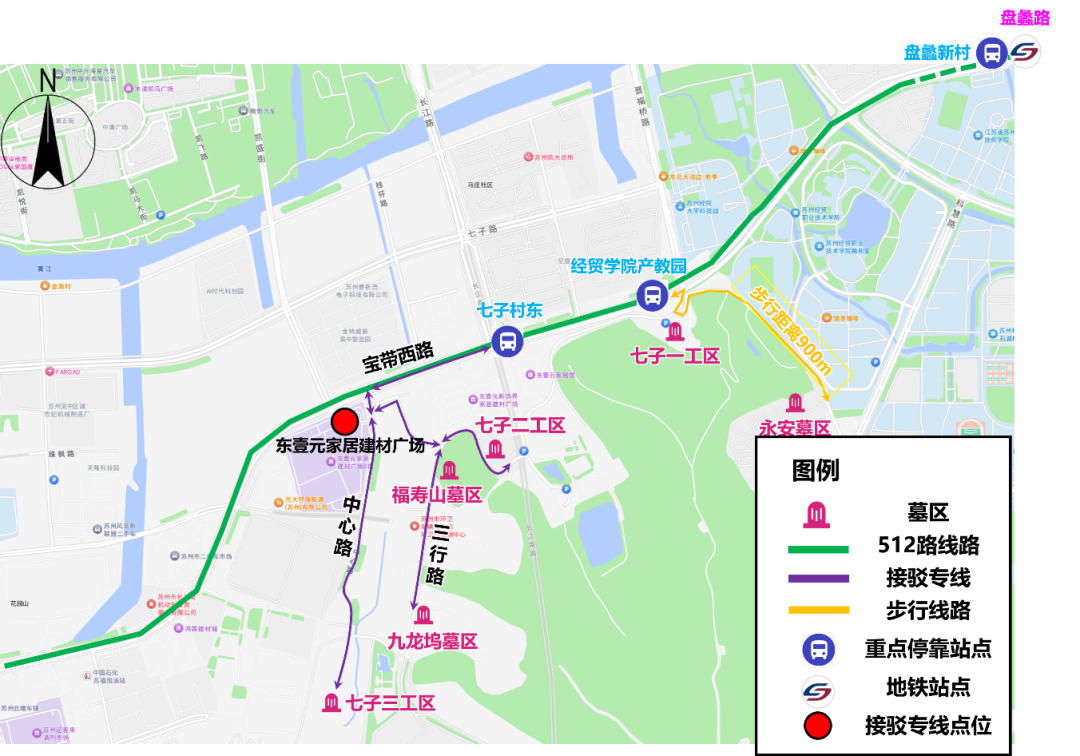 注:1、清明扫墓期间,常规公交512路7:00-13:00加密发车班次。2、扫墓结束后,可至原线下车站点对向公交站点乘车返回地铁2/3号线“盘蠡路”站。