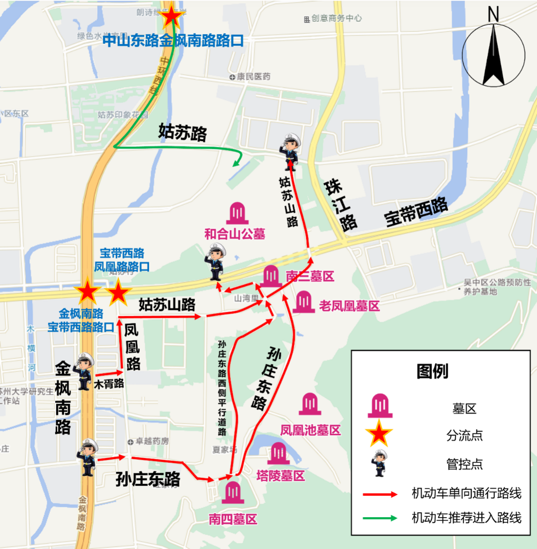 (2)凤凰公墓(南三墓区):中环西线快速路(刘庄路出口)-金枫南路-木胥路-凤凰路-姑苏山路(南三墓区)。
