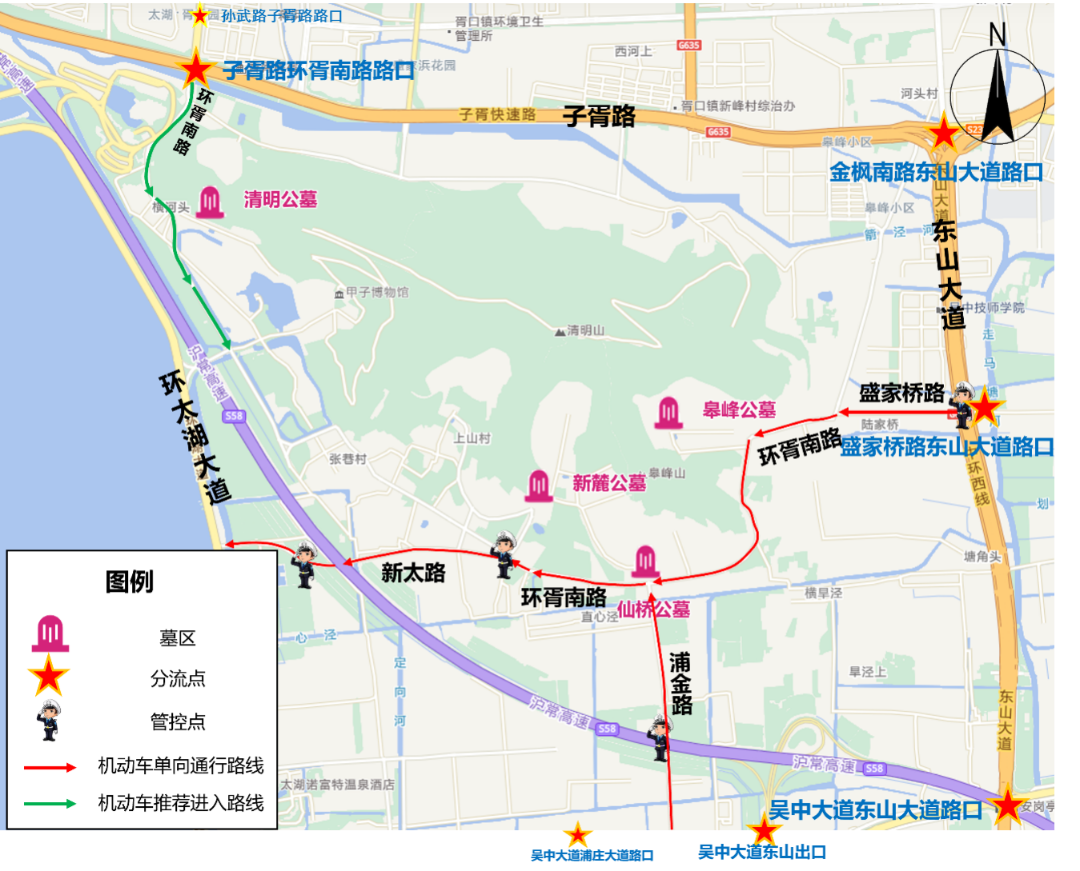 注:扫墓结束后,可至原线下车站点乘公交接驳专线返回地铁5号线太湖香山站。