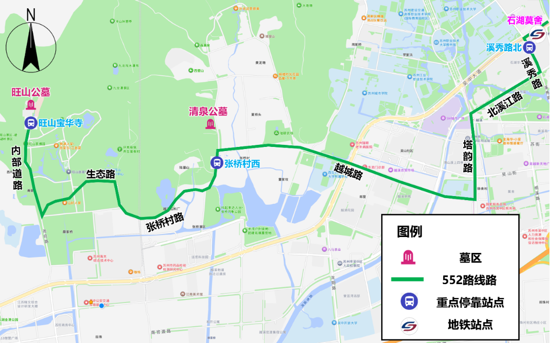 接驳路线:溪秀路北公交站(地铁7号线石湖莫舍站南侧50米)-吴中大道-溪秀路-北溪江路-塔韵路-越城路-张桥村路(张桥村西公交站:清泉公墓)-生态路-尧旺路(旺山宝华寺公交站:旺山公墓)。