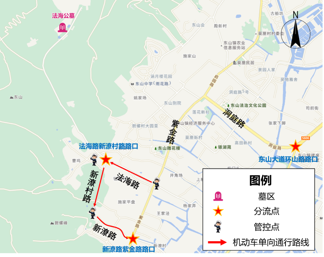 分流点位:法海路新潦村路路口、新潦路紫金路路口、东山大道环山路路口。