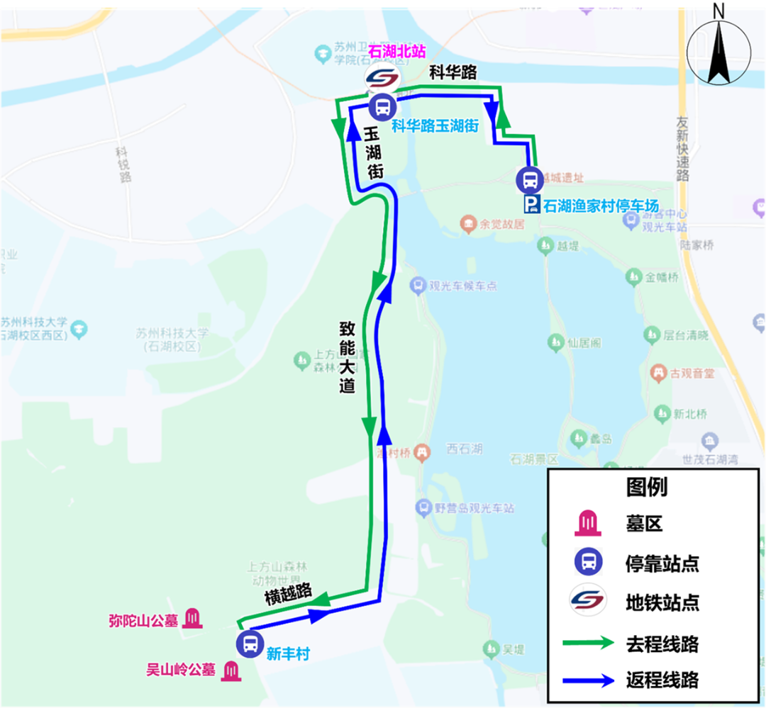 接驳线路(7:00-13:00):石湖渔家村停车场-科华路(地铁3号线石湖北地铁站)-玉湖街-致能大道-横越路(吴山岭墓区、弥陀山公墓)。
