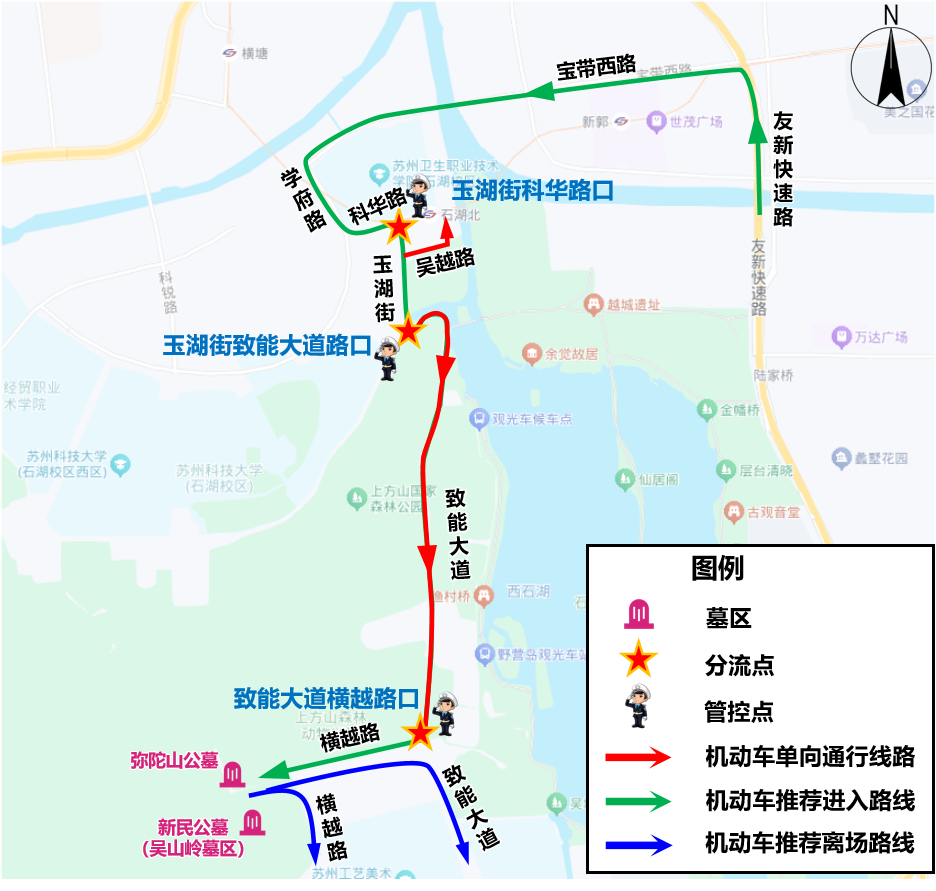 行车线路:友新快速路(宝带西路出口)-宝带西路-学府路-科华路-玉湖街-致能大道-横越路(吴山岭墓区、弥陀山公墓)。