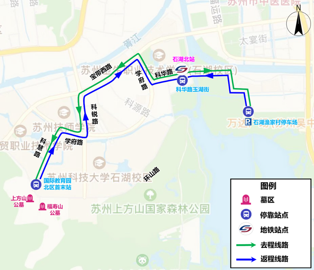接驳线路(7:00-13:00):石湖渔家村停车场-科华路(3号线石湖北地铁站)-学府路-宝带西路-科锐路-学府路-科慧路(国际教育园北区首末站:上方山公墓、福寿山公墓)。